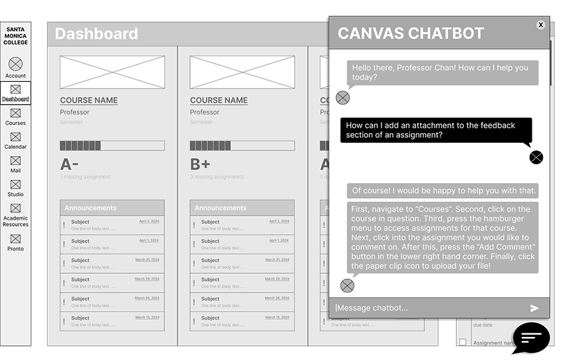 The initial goal was simple: create a chatbot within Canvas to answer student questions. But as the wireframes developed, it became clear that the chatbot could only succeed in an environment where the platform itself was organized. This led to the beginnings of a top-down redesign of Canvas.