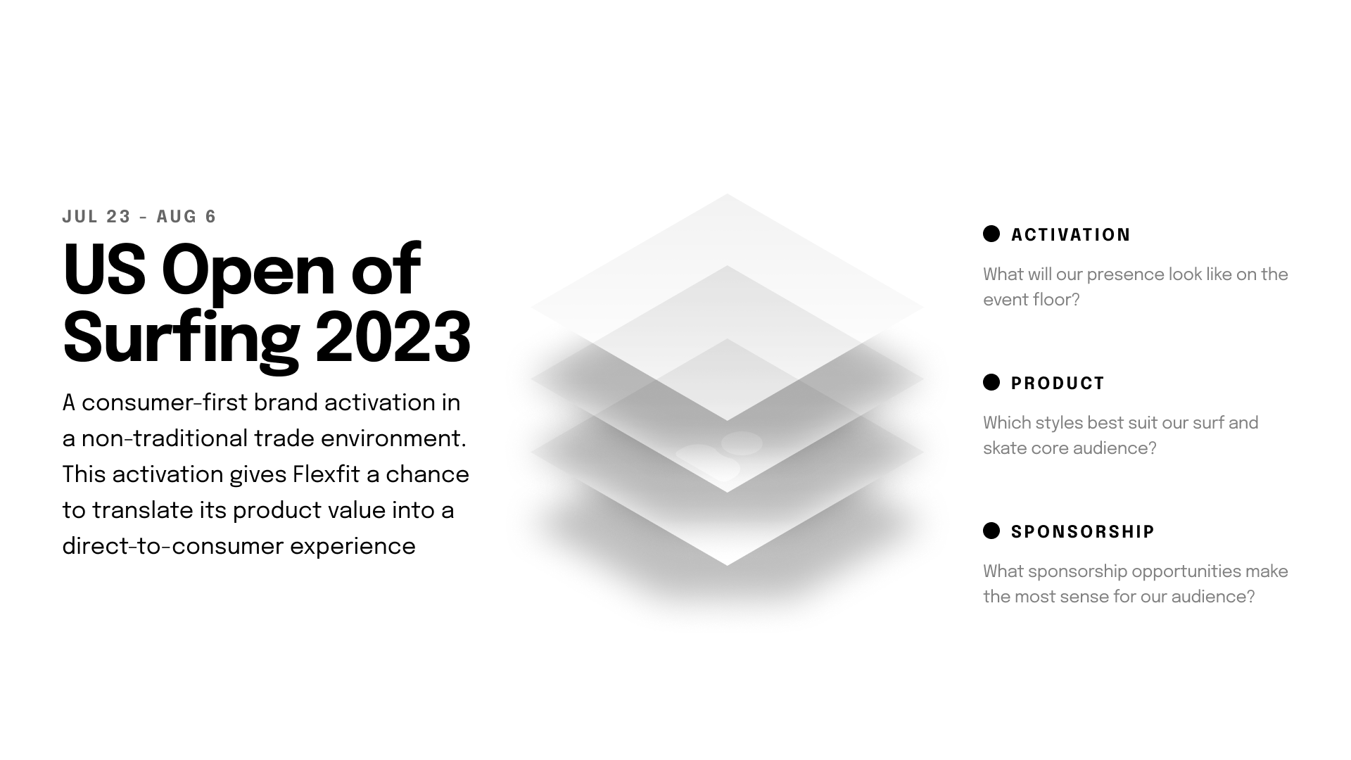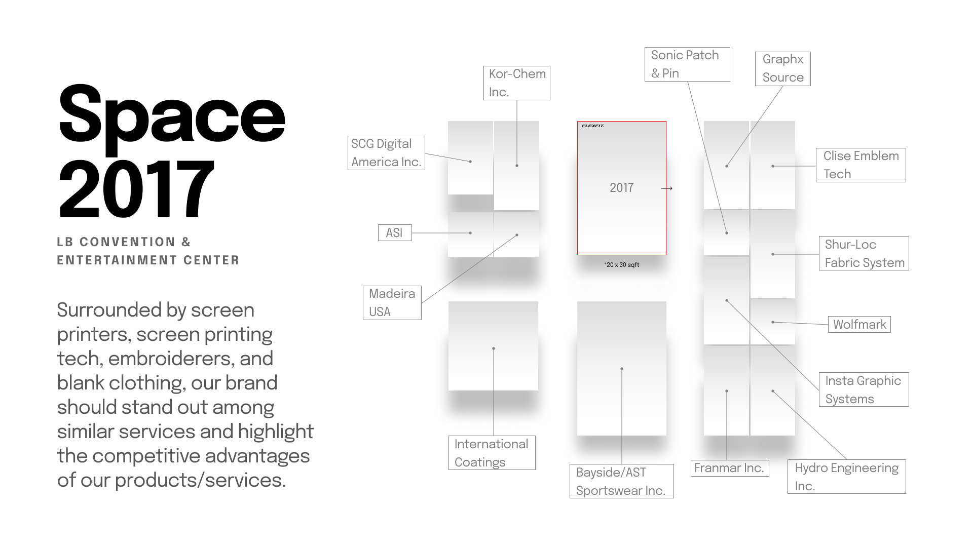 With a clear understanding of who we were designing for, we explored how Flexfit could stand out in environments where many competitors relied on similar booth layouts and static product displays. We reviewed competitor booths across multiple shows and identified common patterns: